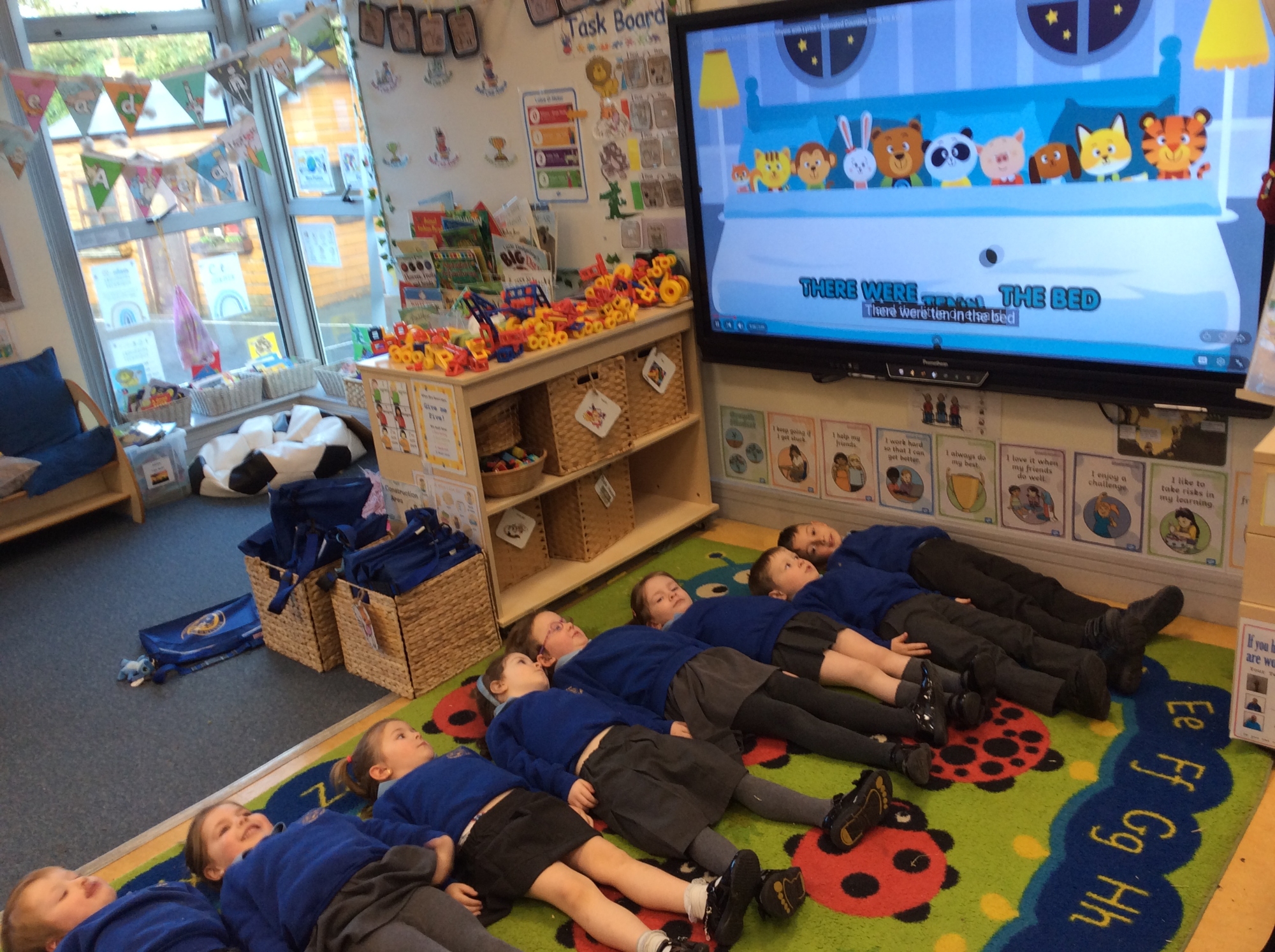We can now write numbers 1-10 and we have started learning to 'add' numbers. Below you can see us having fun acting out the song, '10 in the Bed'.